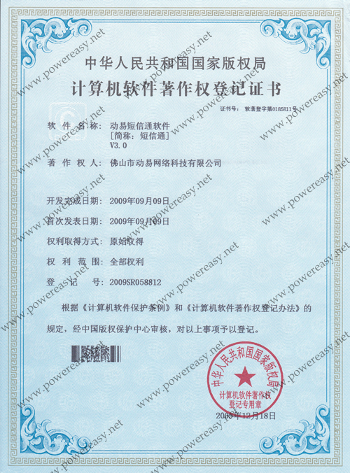 軟件產(chǎn)品登記證書 動易短信通軟件V3.0