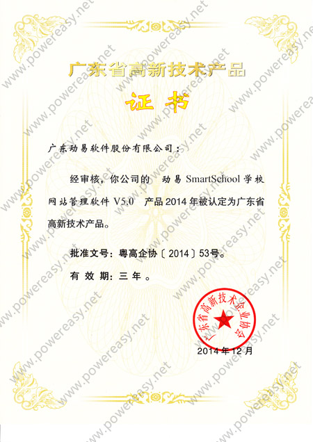 廣東省自主創(chuàng)新產(chǎn)品認(rèn)定證書 動易SmartSchool V3.0
