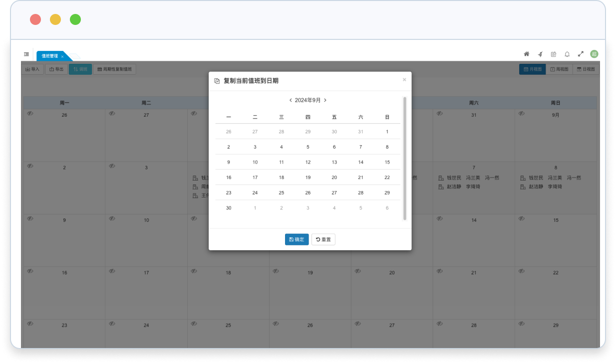 - 支持將某一天已經(jīng)排好的值班信息復(fù)制到其他日期,以實(shí)現(xiàn)當(dāng)多天的排班信息是相同時(shí)可以一步完成,從而提升排班效率。