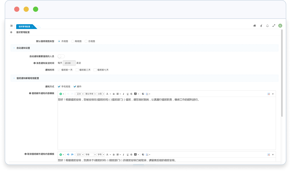 - 支持在值班前一天/三天/七天自動(dòng)給值班人員發(fā)送值班通知。通知方式支持郵件和手機(jī)短信,通知內(nèi)容支持自定義。