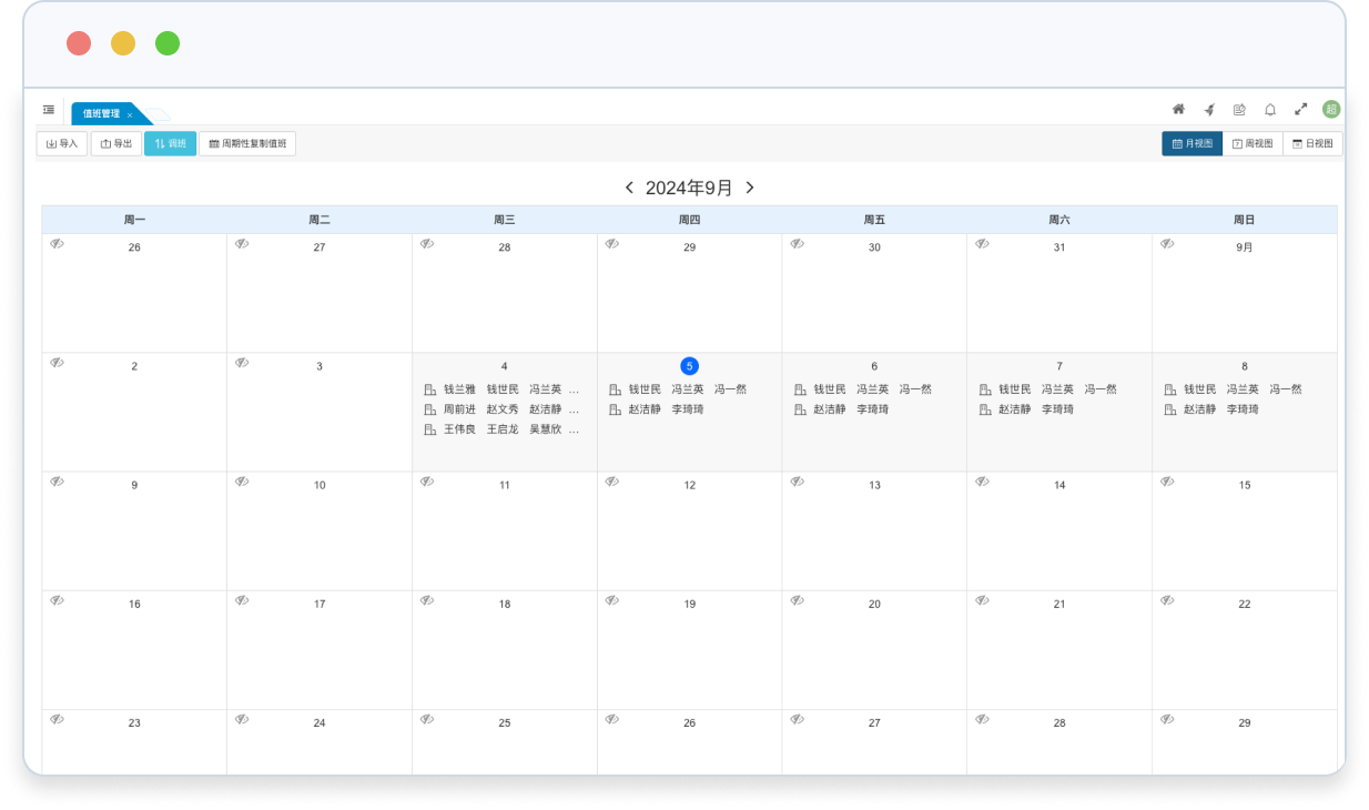 - 所見(jiàn)即所得的排班界面,提供日/周/月視圖排班模式,適配不同規(guī)模人員調(diào)度;