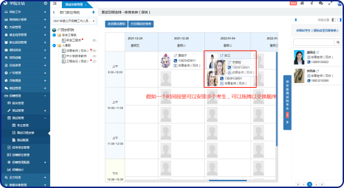 中欄為本次招生考試項(xiàng)目的班級(jí)列表,每個(gè)班級(jí)名稱后顯示相應(yīng)的進(jìn)入面試流程的考生總數(shù),假如有“待安排面試時(shí)間”的考生,則用紅點(diǎn)進(jìn)行提醒。右側(cè)為待安排面試考生列表,中間為面試日程安排表。