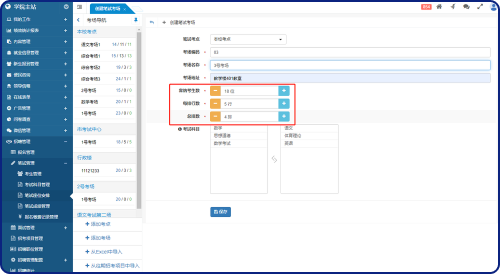 設(shè)置科目名稱、適用班級(jí)(多選)、開始考試時(shí)間,結(jié)束考試時(shí)間、滿分、及格分。每次招生考試項(xiàng)目的筆試科目可能并不一樣,每次添加的考試科目默認(rèn)屬于當(dāng)前招生考試項(xiàng)目。