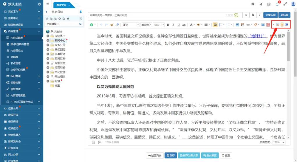系統(tǒng)支持錯(cuò)別字和敏感詞的檢查功能。當(dāng)發(fā)現(xiàn)錯(cuò)別字或者敏感字時(shí),點(diǎn)擊結(jié)果時(shí)會(huì)自動(dòng)定位到編輯器中的具體位置,并將其標(biāo)注出來。編輯人員可以手動(dòng)確認(rèn),確認(rèn)是錯(cuò)別字和敏感字時(shí)可點(diǎn)擊“更正”按鈕由系統(tǒng)自動(dòng)修正這些錯(cuò)誤。