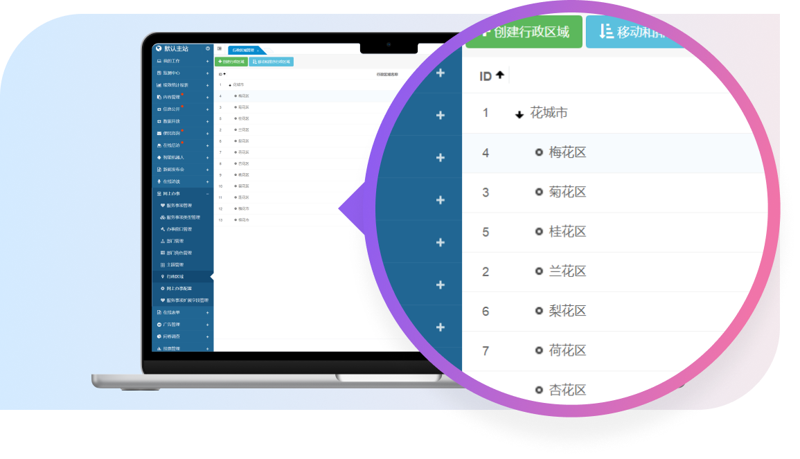 支持創(chuàng)建、修改、查看、刪除行政區(qū)域,還提供了搜索與篩選功能,讓用戶能夠迅速定位到目標(biāo)行政區(qū)域。
