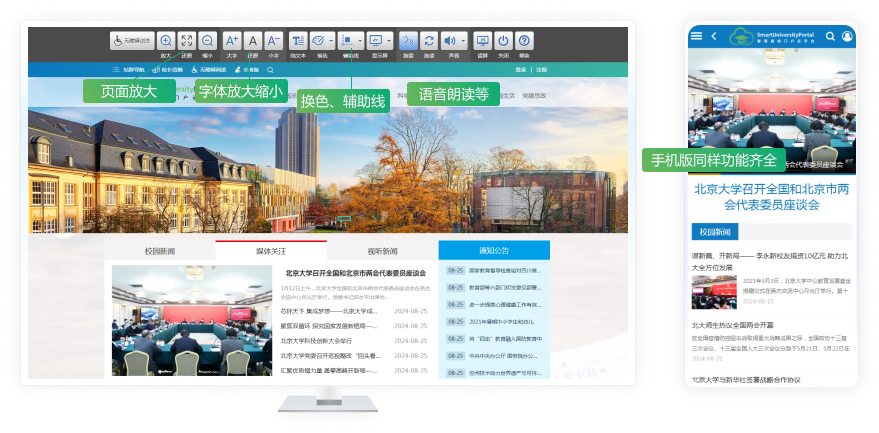 SmartUniversityPortal 是動(dòng)易基于 WebFuture 智慧門(mén)戶(hù)管理平臺(tái),為滿(mǎn)足高校門(mén)戶(hù)網(wǎng)站群集約化建設(shè)、信創(chuàng)適配、移動(dòng)適配、全媒體發(fā)布和監(jiān)測(cè)、無(wú)障礙改造和適老化建設(shè)等需求而量身定制的全套智慧高校門(mén)戶(hù)集群解決方案,并集成眾多業(yè)務(wù)系統(tǒng)以滿(mǎn)足高校在證書(shū)管理、在線(xiàn)學(xué)習(xí)、知識(shí)競(jìng)賽、新生報(bào)到、畢業(yè)生就業(yè)追蹤、雙選管理、招聘考試、預(yù)約面試等多方面業(yè)務(wù)需求。該方案助力高校應(yīng)對(duì)信息化管理的復(fù)雜挑戰(zhàn),提升門(mén)戶(hù)網(wǎng)站集約化建設(shè)水平,全面滿(mǎn)足高校在安全性、各類(lèi)業(yè)務(wù)系統(tǒng)和數(shù)字化服務(wù)中的多樣化需求。