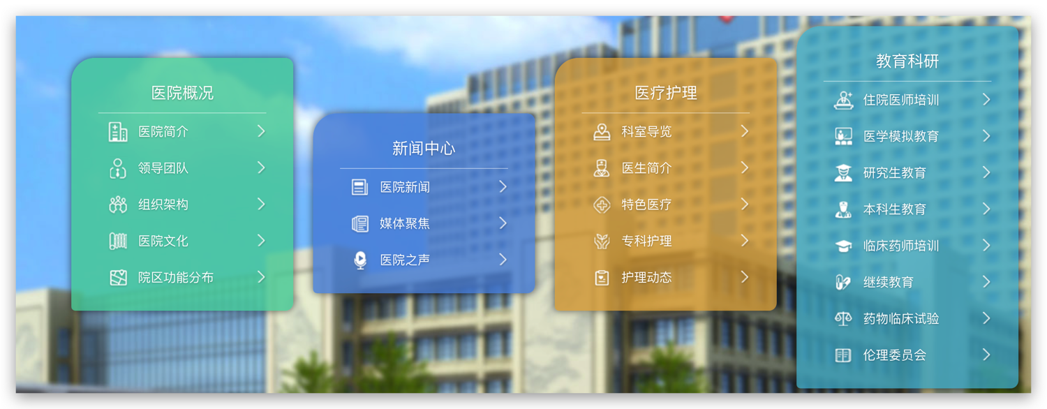 • 社會入口主要展示醫(yī)院概況、科研教學(xué)、動(dòng)態(tài)新聞等,讓公眾快速了解醫(yī)院品牌與實(shí)力。