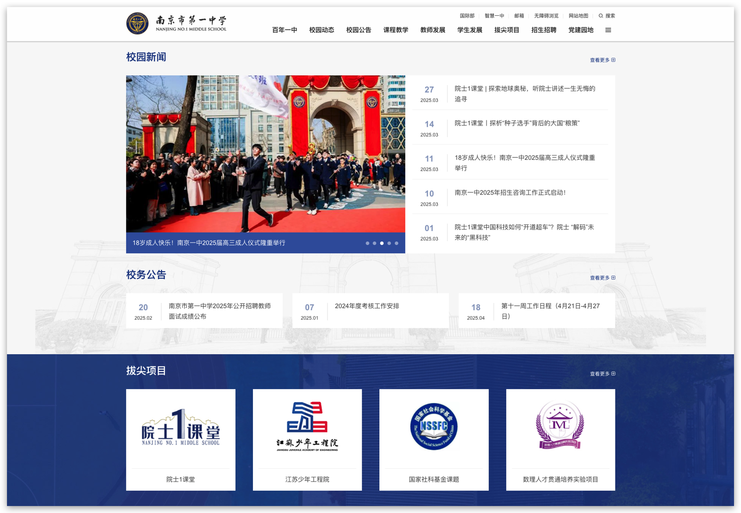 南京市第一中學網站平臺采用動易SmartEduPortal 基礎教育網站群解決方案構建,極大提升了網站系統(tǒng)平臺的安全性、穩(wěn)定性和先進性。網站平臺功能完善,管理操作簡易快捷,后臺內容采編發(fā)、網站運維監(jiān)測、站群數據統(tǒng)計功能、稿件流程管理、網站智能搜索、績效統(tǒng)計報表、內容檢查等功能全面提升校園網站建設和管理服務水平,充分發(fā)揮校園網展示形象、彰顯特色、強化服務等功能,提升校園信息化水平,推動學校教育高質量發(fā)展。